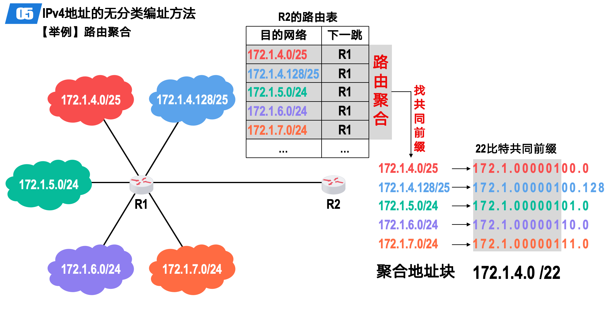 CIDR的一个核心优势是路由聚合,它允许将多个连续的CIDR地址块合并成一个更大的地址块,从而在路由表中用一个条目来表示多个网络。这个过程也称为构成超网(Supernetting)。