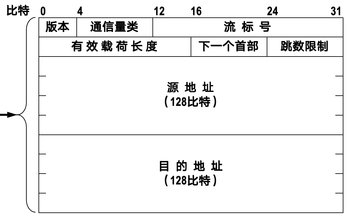 IPv6数据报的首部长度是固定的,为40字节. 相比IPv4, IPv6首部去掉了许多字段, 使得处理更加简单高效.