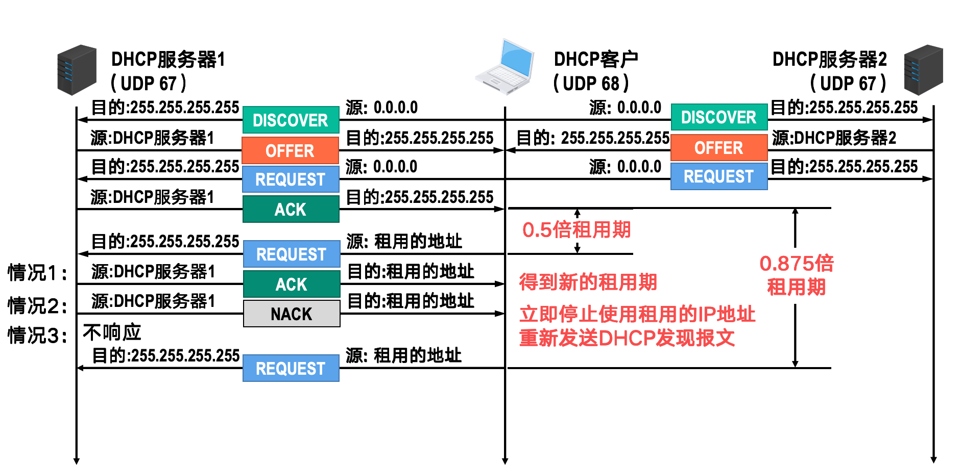 DHCP 的交互过程通常被称为 DORA (Discover, Offer, Request, Acknowledge)。