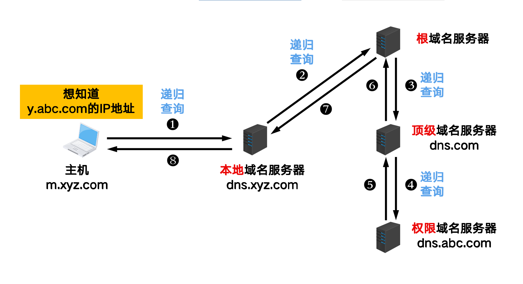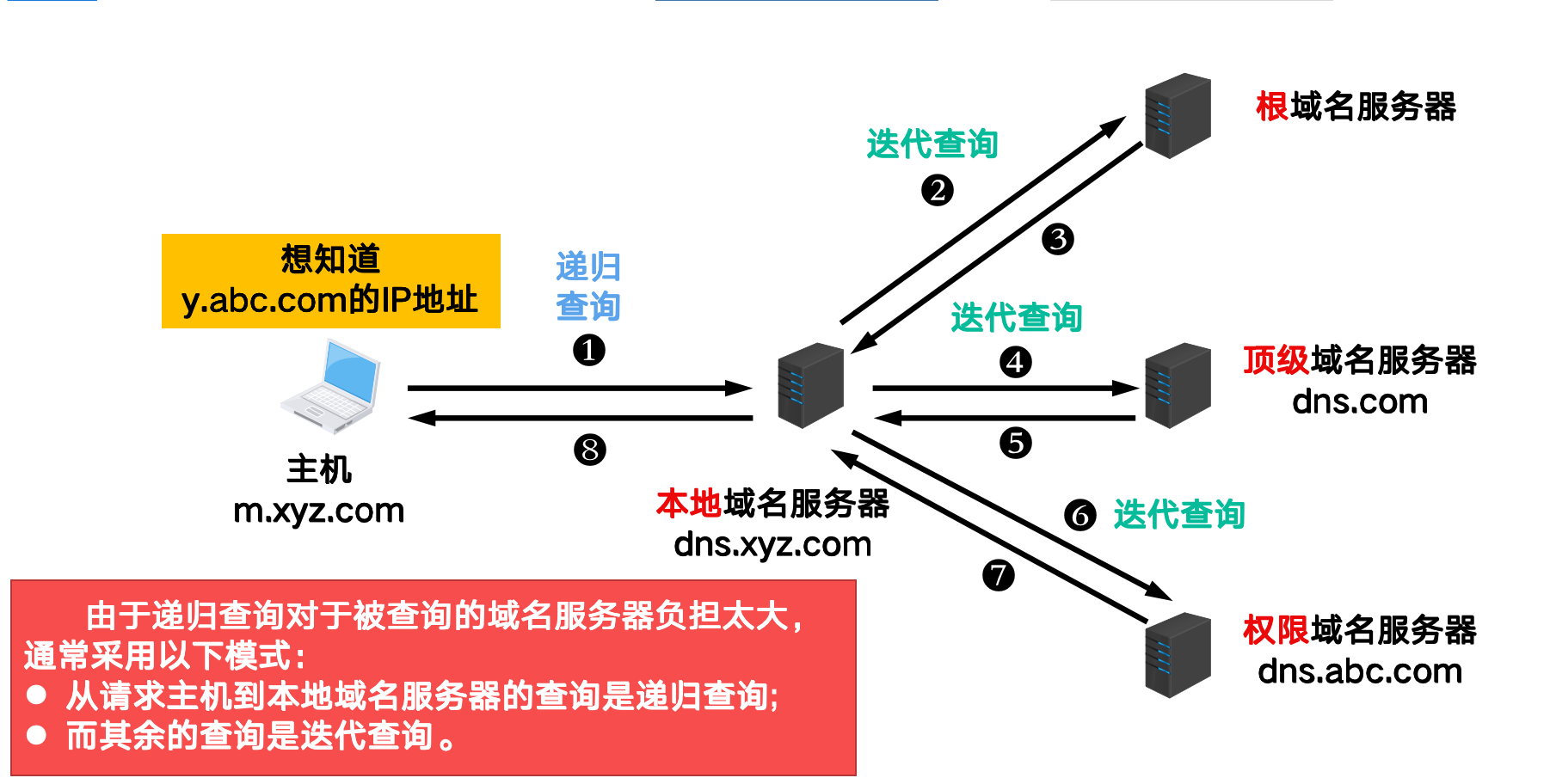 - 特点: 被查询的服务器必须给出最终的查询结果(IP 地址或报错),即 "要么给结果,要么你自己去查然后给我结果"。