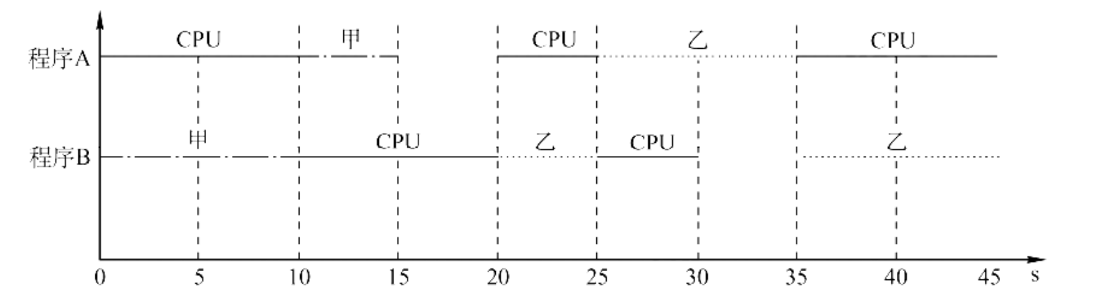 程序B:设备甲 10s → CPU 10s → 设备乙 5s → CPU 5s → 设备乙 10s