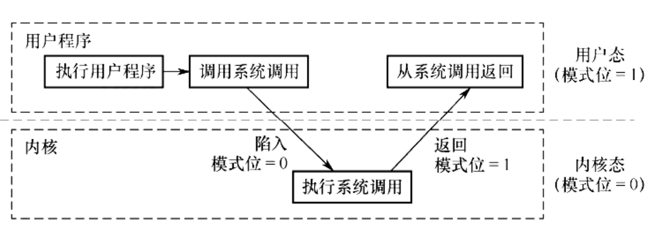 - CPU执行陷入(trap)指令,状态从用户态切换到内核态。