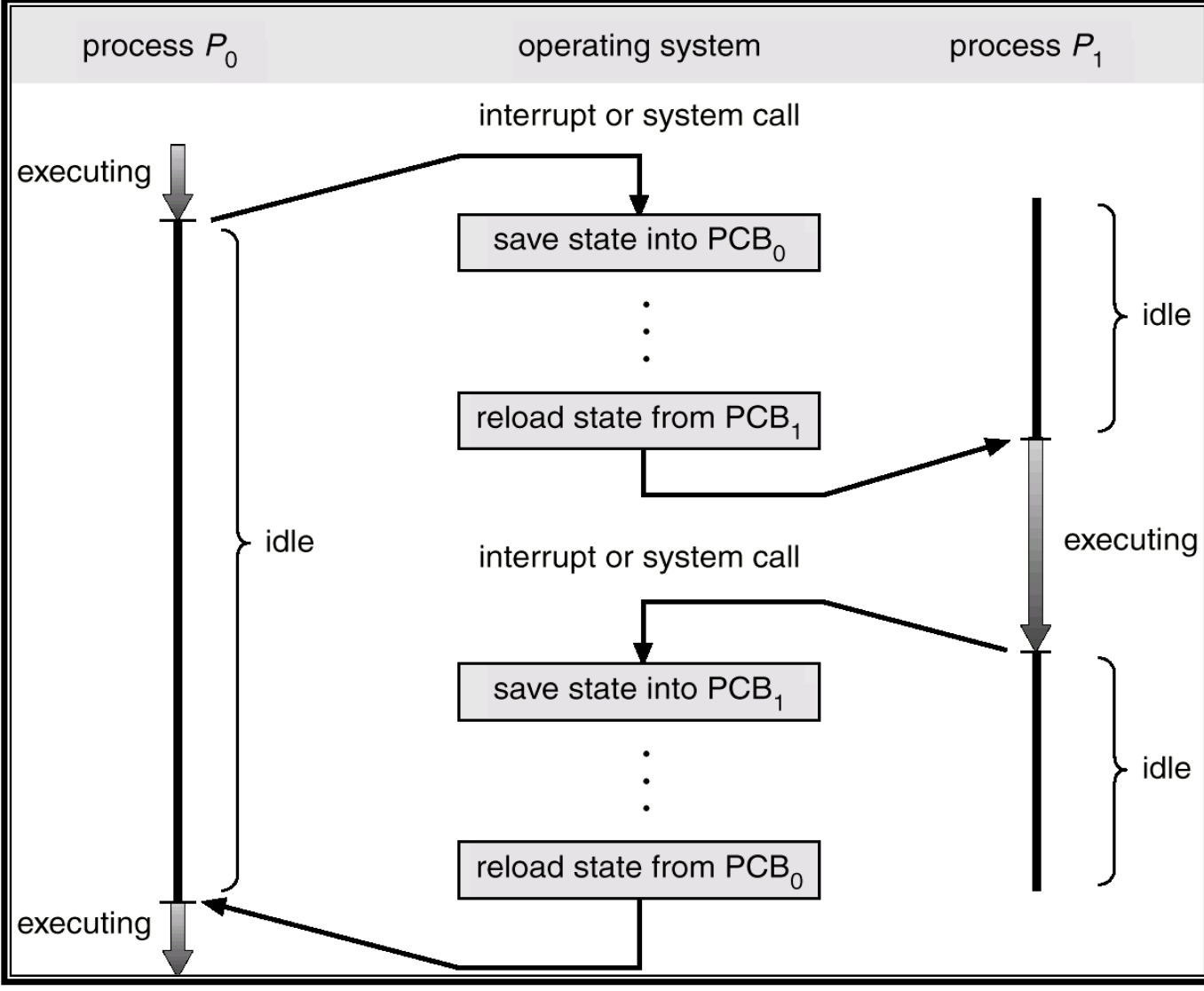 当操作系统从一个进程切换到另一个进程时,需要保存当前进程的状态(寄存器值,程序计数器等)到它的PCB中,然后加载下一个进程的状态到CPU寄存器中.这个过程称为上下文切换(Context Switch).