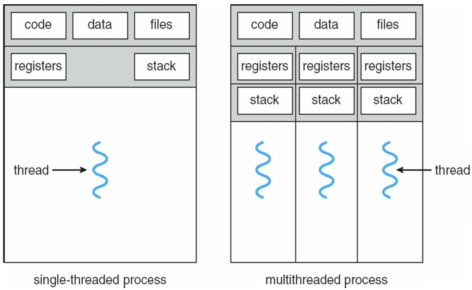 要注意的是,统一进程中不同线程所共享的只有进程的资源(如内存空间,文件描述符等),而每个线程有自己的寄存器状态和栈空间.