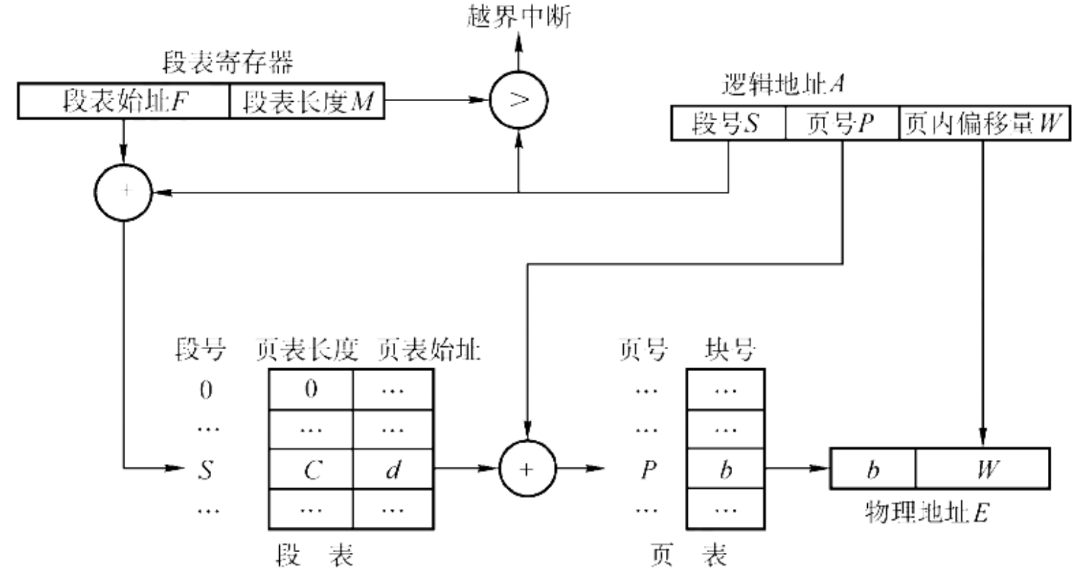由三部分组成:<段号 S, 页号 P, 页内偏移 W>