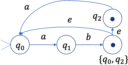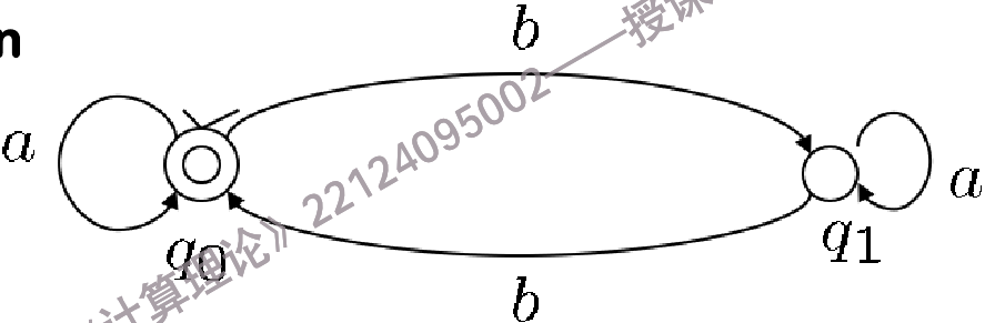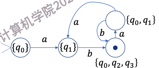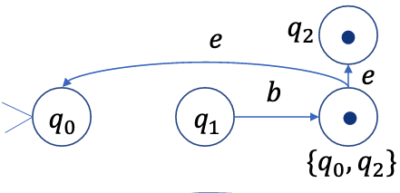 这里的非确定性来源于状态\(q_1\)在输入\(b\)时,可以转换到状态\(q_0\)或\(q_2\).因此,我们把\(q_0\)和\(q_2\)合并成一个新状态\(q_{0,2}\),表示可能处于状态\(q_0\)或\(q_2\).这样,我们就消除了非确定性.